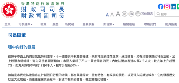 10月5日,香港财政司司长陈茂波发表署名文章称,国庆中秋假期前四天,内地访港旅客达87.7万人次,较去年上升超7%,而海外旅客亦有约12.6万人,同比增长超30%。