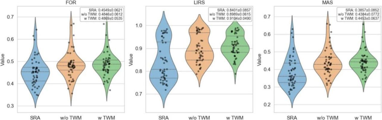 在标准重建(SRA)、无TWM和有TWM方法的FOR、LIRS和MAS指标比较