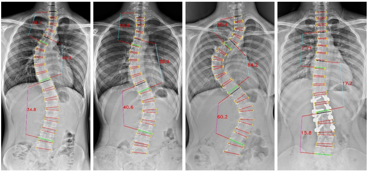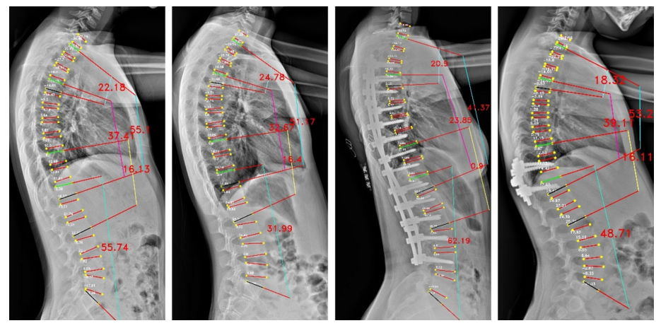 The vertebrae four corner points and the Cobb angles measurement for LAT view images