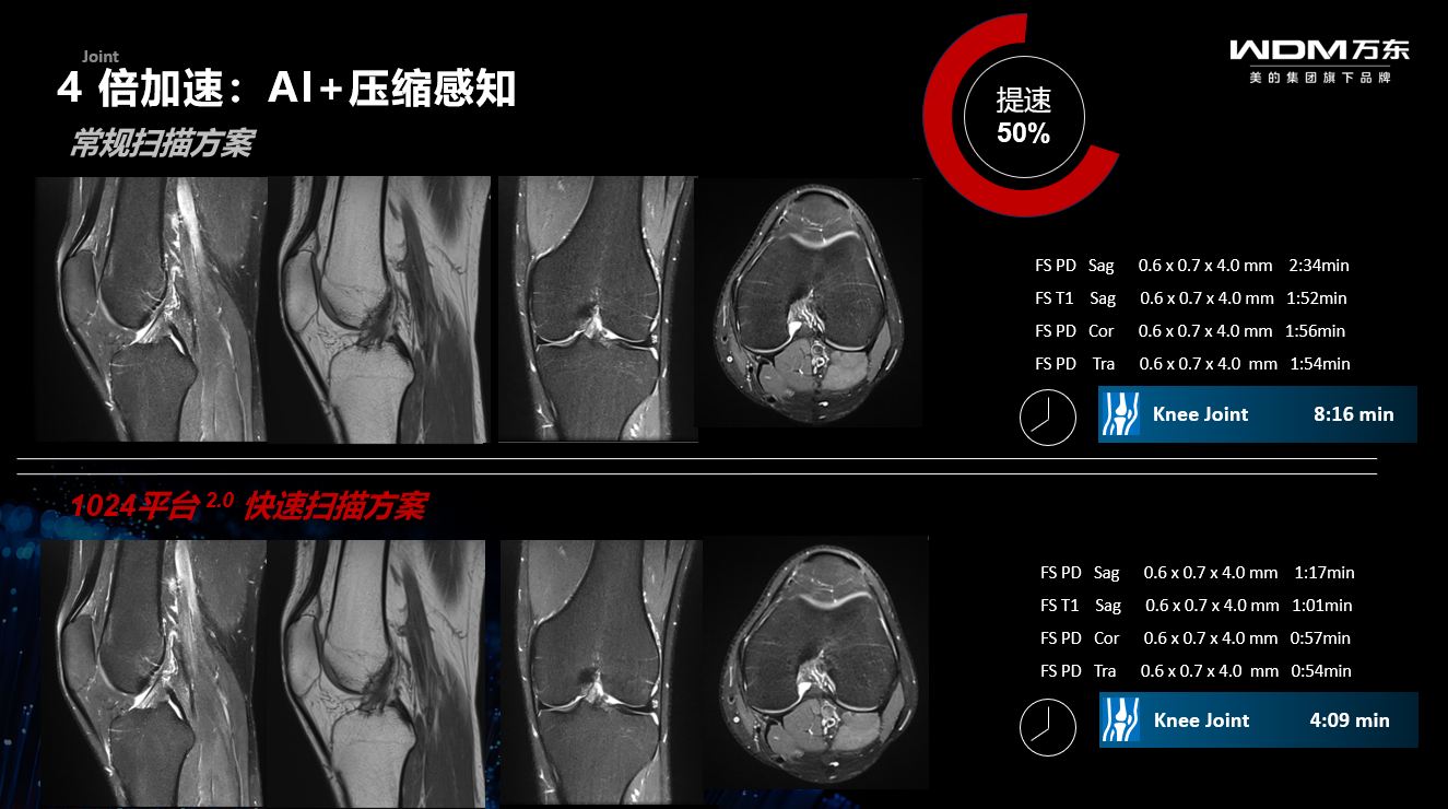 在磁共振领域,基于1024广域深度学习平台,图像去噪增强功能,显著提高图像的SNR和CNR,将常规头颅平扫速度提升61%,膝关节扫描速度提升50%,为临床高效检查提供新路径。