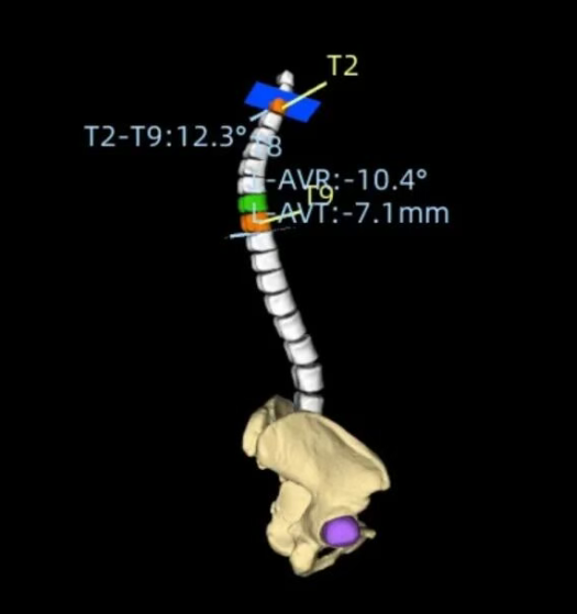 基于负重位CBCT的全脊柱三维Cobb角自动测量,实现了椎体的高精度自动分割,其Dice系数达0.9776(自动分割的结果越准确,Dice值就越接近1),误差极小;三维Cobb角测量可接受度>97.05%,关键椎体识别准确率98.53%,显著优于传统方法。基于负重位CBCT椎体轴向旋转角度自动测量,与人工测量一致性ICC 达0.76,误差控制在±3.04° 内,实现了对椎体旋转的客观、高效、可重复测量,一键自动生成,高效助力临床精准诊疗。该研究入选中华医学会放射学学术大会(CCR 2025)。