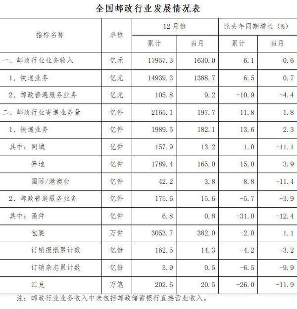 12月份,邮政行业业务收入完成1630.0亿元,同比增长0.6%。其中,快递业务收入完成1388.7亿元,同比增长0.7%。