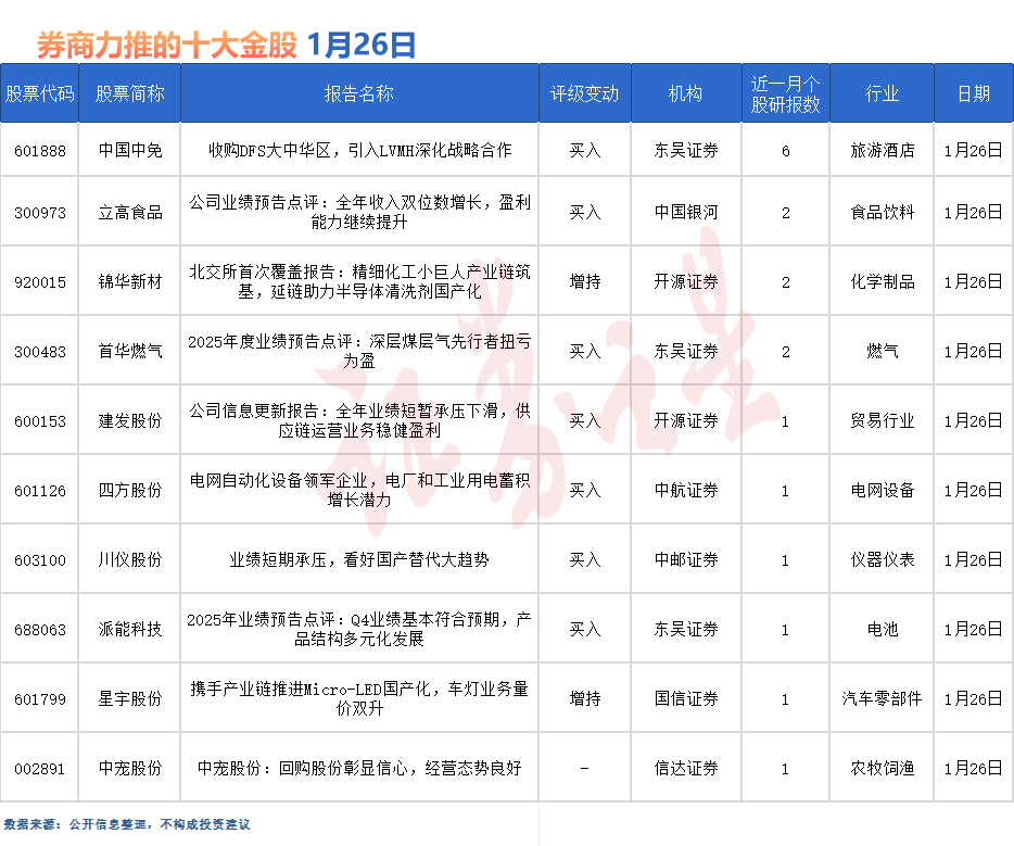 中国中免最受券商关注,近一个月获国金证券、中银证券、中国银河、国金证券等6份券商研报关注,位居1月26日券商力推股榜首。