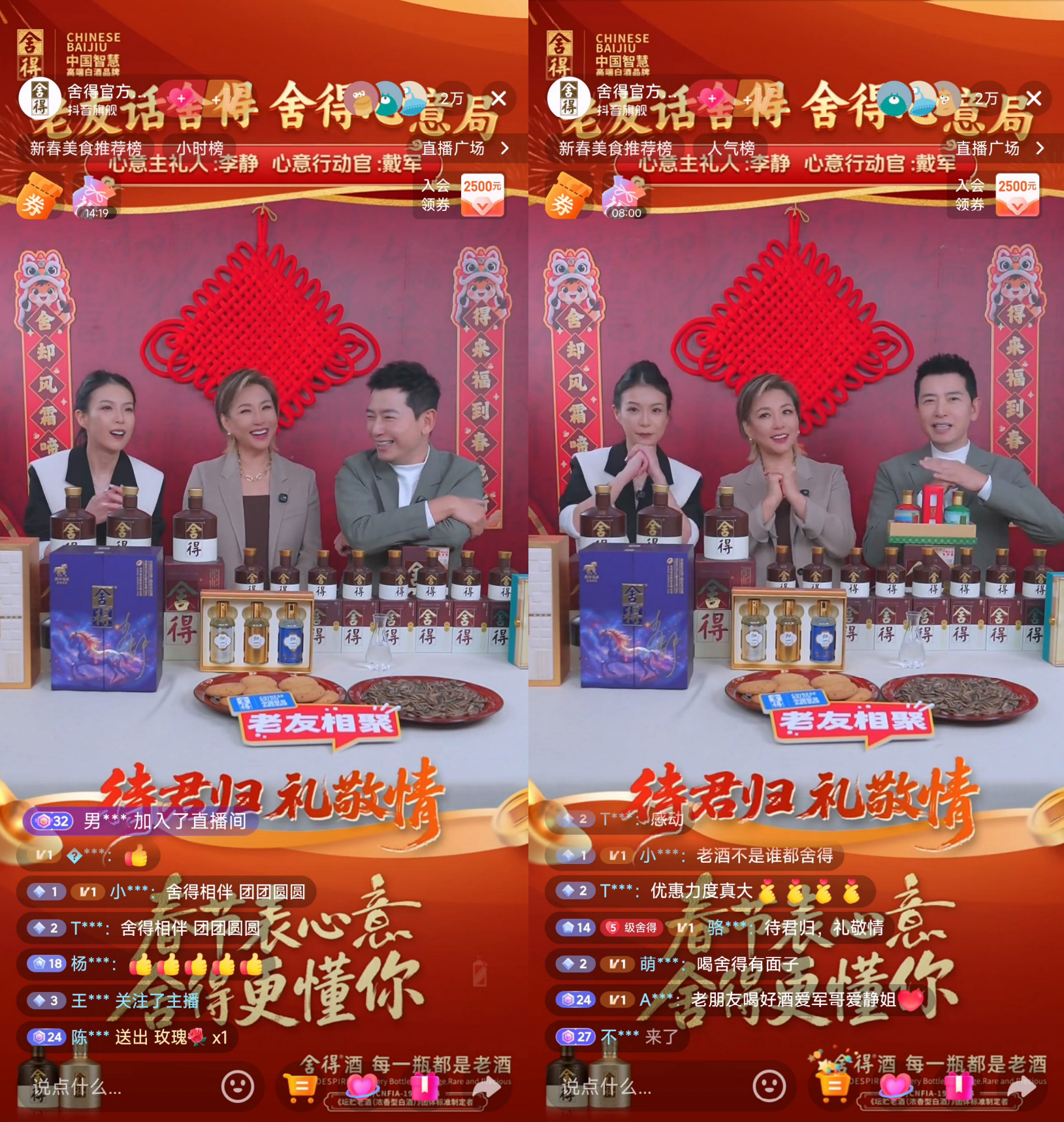 紧扣“春节表心意”主线,舍得酒还邀请李静、戴军做客官方直播间,并通过话题挑战赛及一系列市场动作,打通从情感共鸣到消费转化的营销闭环,实现品牌声量、用户好感与市场销售的同频共振,将舍得酒春节营销氛围推向高潮。