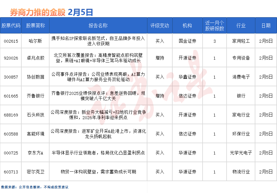 哈尔斯最受券商关注,近一个月获信达证券等3份券商研报关注,位居2月5日券商力推股榜首。