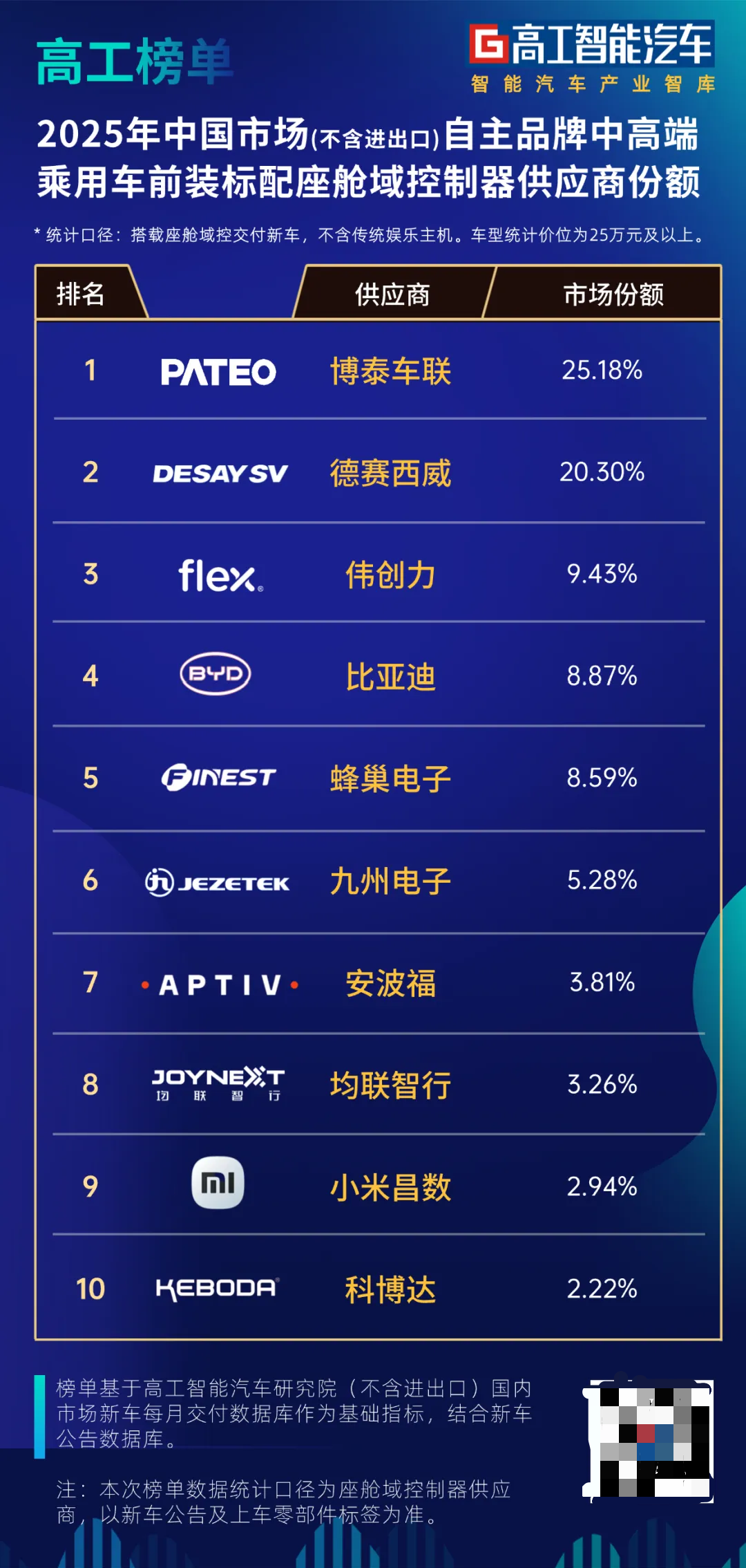 按照高工智能汽车研究院给出的最新数据显示,2025年在国内中高端价位的25万元以上自主品牌车型市场,博泰车联在座舱域控产品线以25.18%的市场份额领跑,上述价位区间每四辆车就有一辆搭载博泰车联的解决方案。