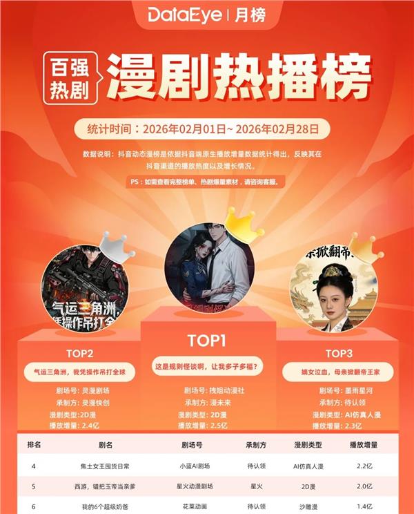 日前,AI漫剧《气运三角洲,我凭操作吊打全球》表现亮眼,仅用29小时突破2亿次播放,强势登顶春节档多个榜单。近日,DataEye研究院发布的2月漫剧热播百强榜中,《气运三角洲》再度上榜,以2.4亿次播放跻身月度Top2,夯实2026开年漫剧现象级爆品位置。