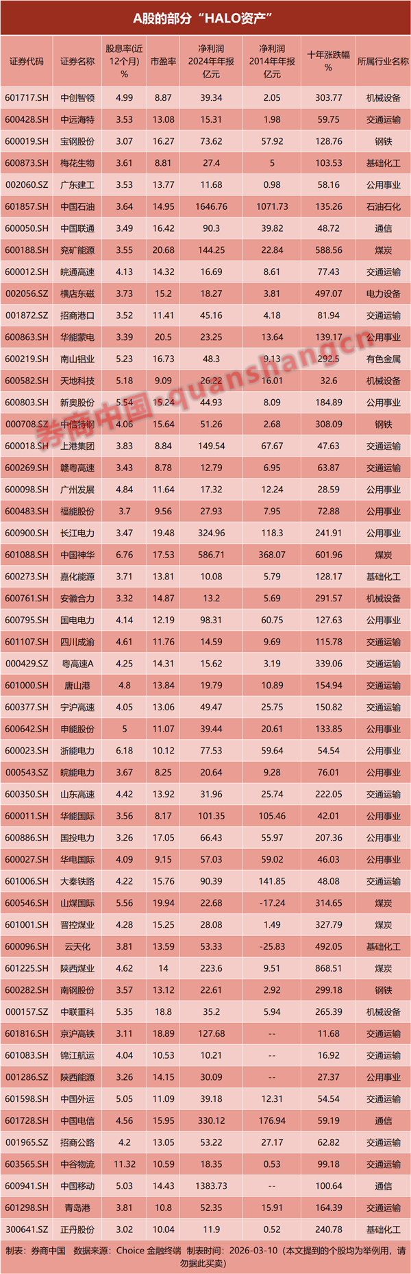 过去十年,“HALO资产”表面上默默无闻,从来不在风口,但其实涨幅可观。中国神华过去十年上涨6倍,陕西煤业上涨8.7倍,涨幅堪比科网股;长江电力和国投电力的涨幅均在2倍以上,年化收益超过10%;安徽合力和中创智领等机械设备公司十年涨幅3倍左右;基础化工公司正丹股份涨幅超过2倍。