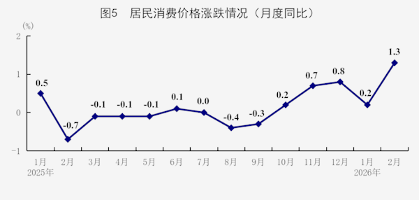 1—2月份,全国居民消费价格(CPI)同比上涨0.8%,其中1月份上涨0.2%,2月份上涨1.3%。分类别看,1—2月份,食品烟酒及在外餐饮价格同比上涨0.6%,衣着价格上涨1.9%,居住价格下降0.1%,生活用品及服务价格上涨2.7%,交通通信价格下降2.1%,教育文化娱乐价格上涨1.0%,医疗保健价格上涨1.8%,其他用品及服务价格上涨14.3%。在食品烟酒及在外餐饮价格中,猪肉价格下降11.2%,粮食价格下降0.2%,鲜果价格上涨4.5%,鲜菜价格上涨8.8%。扣除食品和能源价格后的核心CPI同比上涨1.3%。从环比看,1月份,全国居民消费价格上涨0.2%,2月份上涨1.0%。