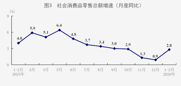 1—2月份,社会消费品零售总额86079亿元,同比增长2.8%,比上年12月份加快1.9个百分点。按经营单位所在地分,城镇消费品零售额74449亿元,增长2.7%;乡村消费品零售额11630亿元,增长3.2%。按消费类型分,商品零售额75815亿元,增长2.5%;餐饮收入10264亿元,增长4.8%。基本生活类和部分升级类商品销售增长较快。限额以上单位服装鞋帽针纺织品类、粮油食品类、通讯器材类、金银珠宝类商品零售额同比分别增长10.4%、10.2%、17.8%、13.0%。从环比看,2月份社会消费品零售总额比上月增长0.81%。1—2月份,服务零售额同比增长5.6%,比上年全年加快0.1个百分点。其中,通讯信息服务类、旅游咨询租赁服务类、文体休闲服务类零售额较快增长。1—2月份,全国网上商品和服务零售额32546亿元,同比增长9.2%。其中,网上商品零售额20812亿元,增长10.3%,占社会消费品零售总额的比重为24.2%;网上服务零售额11734亿元,增长7.3%。