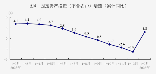 1—2月份,全国固定资产投资(不含农户)52721亿元,同比增长1.8%,上年全年为下降3.8%;扣除房地产开发投资,全国固定资产投资增长5.2%。分领域看,基础设施投资同比增长11.4%,制造业投资增长3.1%,房地产开发投资下降11.1%。全国新建商品房销售面积9293万平方米,同比下降13.5%;新建商品房销售额8186亿元,下降20.2%。分产业看,第一产业投资同比增长17.4%,第二产业投资增长5.4%,第三产业投资下降0.4%。民间投资同比下降2.6%,降幅比上年全年收窄3.8个百分点;扣除房地产开发投资,民间投资增长1.0%。高技术产业投资同比增长5.1%,其中航空、航天器及设备制造业,研发与设计服务业,信息服务业投资分别增长20.2%、20.6%、16.5%。从环比看,2月份固定资产投资(不含农户)比上月增长0.39%。