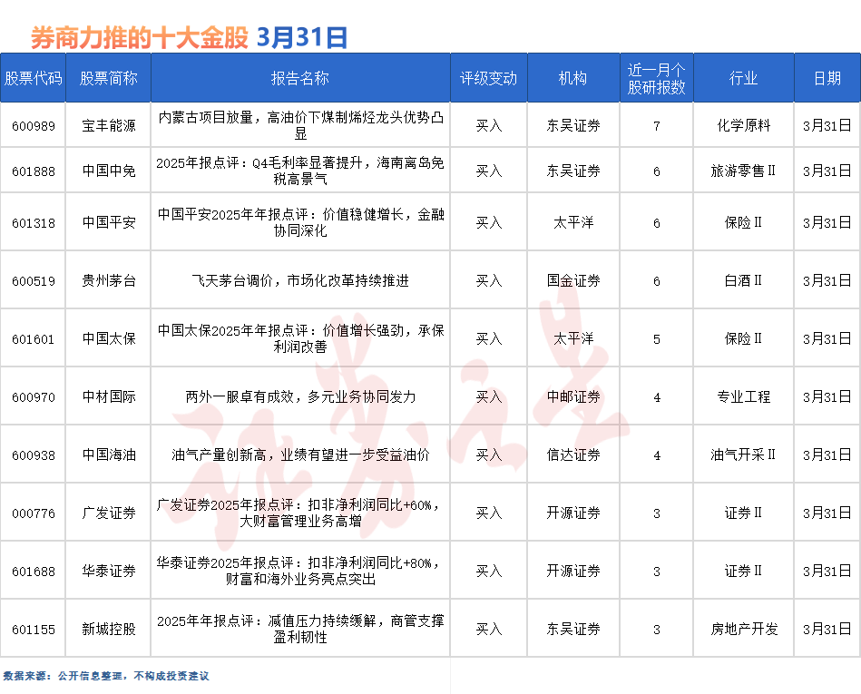 宝丰能源最受券商关注,近一个月获太平洋、中银证券、中邮证券、华鑫证券、国金证券、国信证券等7份券商研报关注,位居3月31日券商力推股榜首。