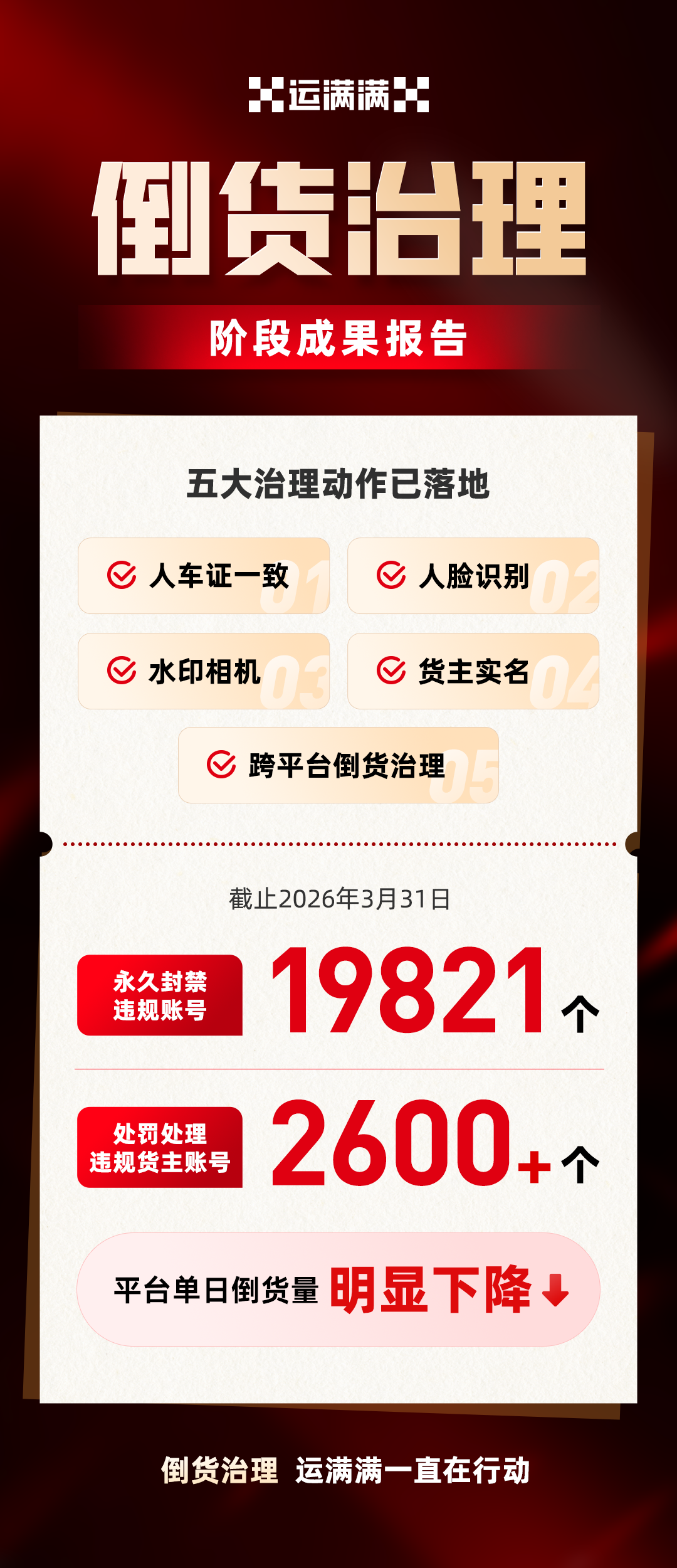 4月13日,数字货运平台运满满正式发布“倒货清源”专项治理最新进展。据悉,自2025年8月以来,平台持续加大整治力度,再封禁违规账号19821个,处罚处理违规货主账号2600多个。随着治理行动的持续开展,平台倒货量明显下降,倒货引发的投诉率也在持续走低,司机与货主权益得到进一步保障。
