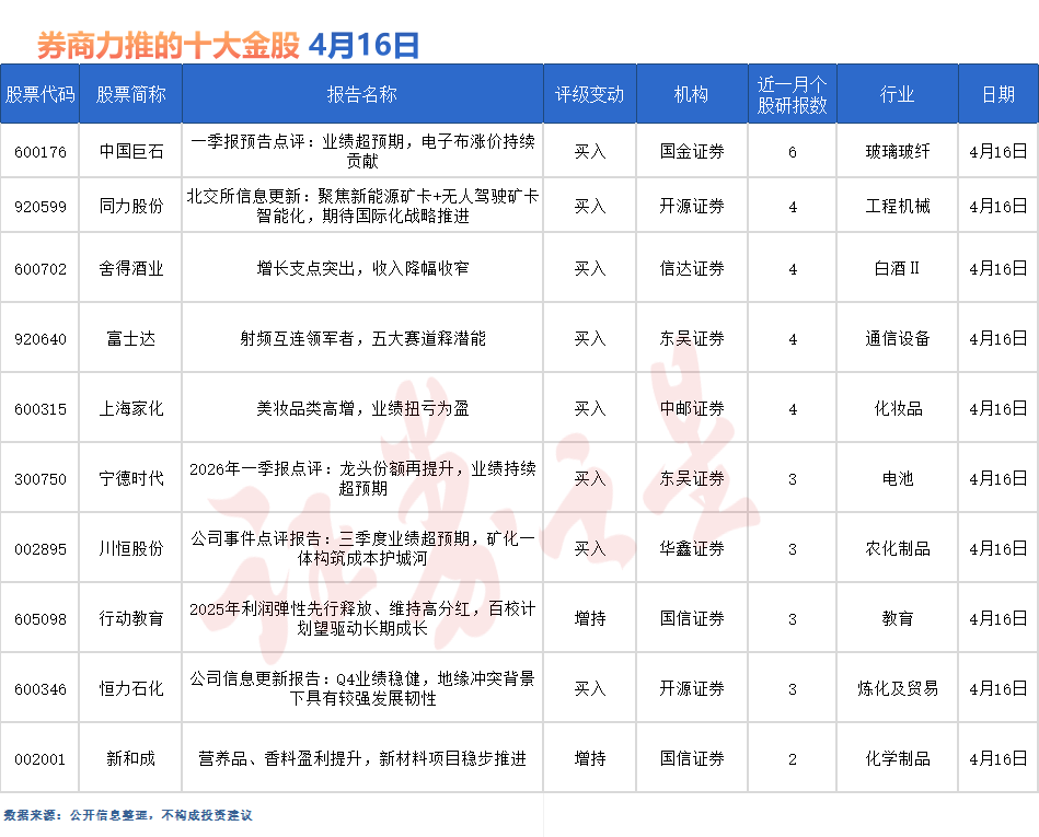 中国巨石最受券商关注,近一个月获中邮证券、东兴证券、东莞证券、东吴证券等6份券商研报关注,位居4月16日券商力推股榜首。